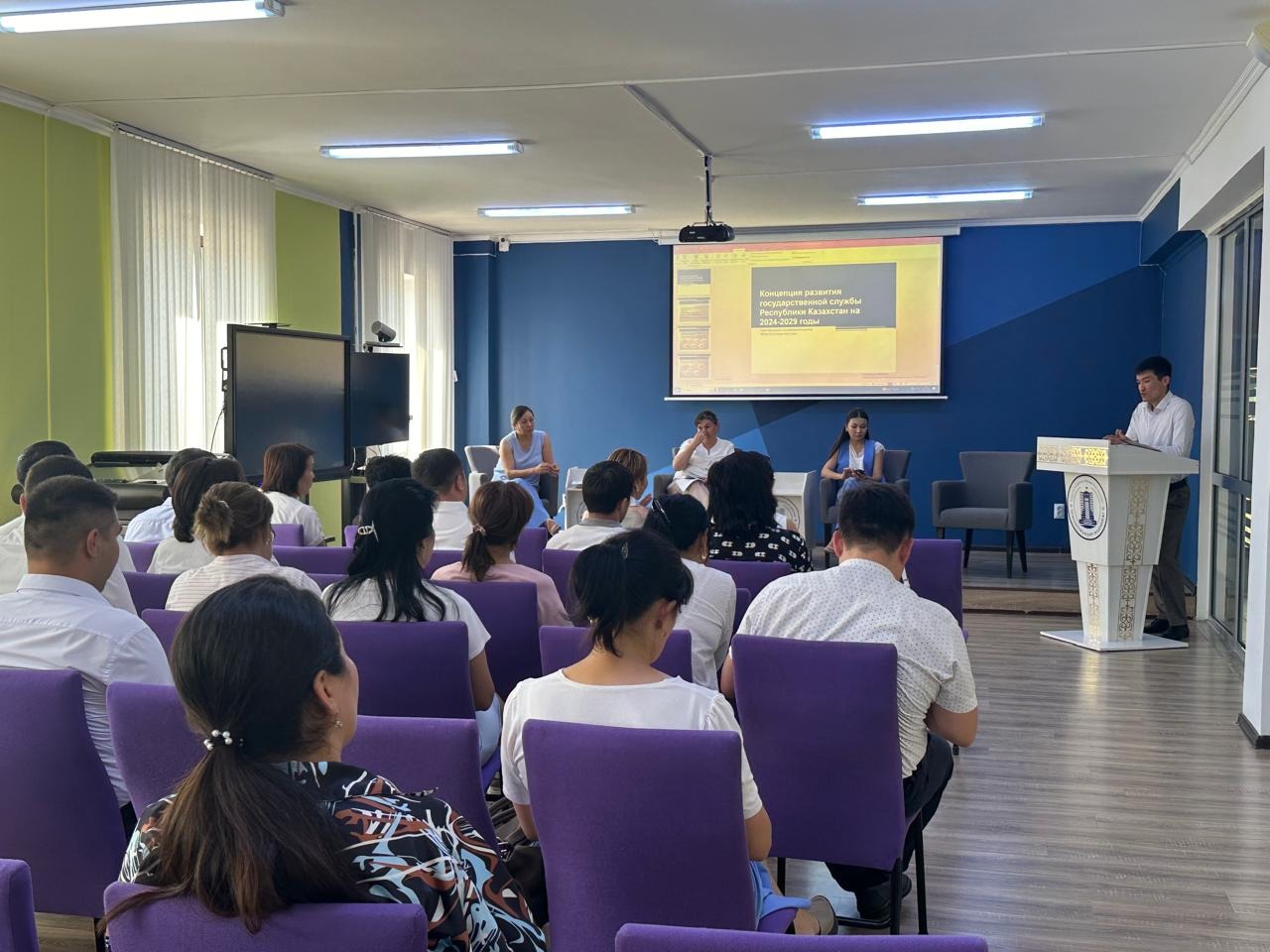 Сонымен бірге, Қазақстан Республикасының мемлекеттік қызметін дамытудың 2024-2029 жылдарға арналған Тұжырымдамасы түсіндіріліп, мемлекеттік қызметшілердің жай-күйі туралы мониторингі бойынша кемшіліктер мен бұзушылықтардың алдын алу, «Е-қызмет» ЫАЖ-дағы жеке істерді толыққанды жүргізу мәселелері талқыланды.