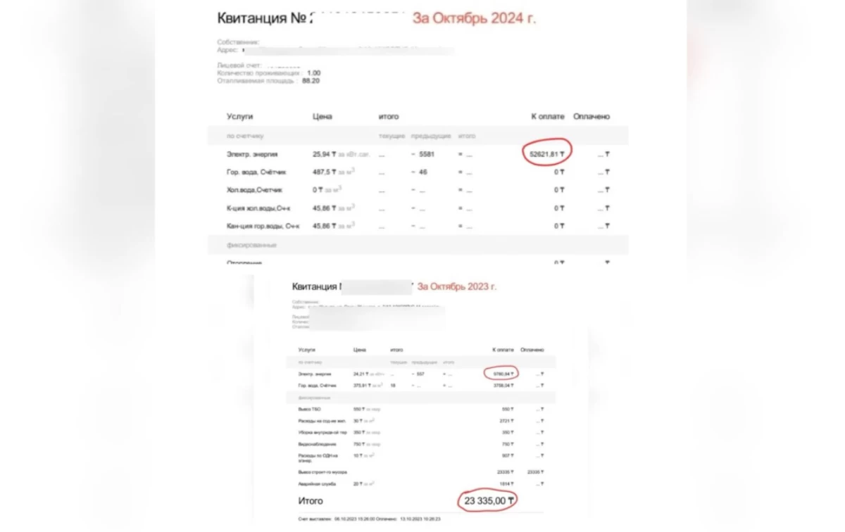 Ал Alma City тұрғыны тамыз және қыркүйек айларындағы төлемдерін жолдап, электр қуатының төлемі төрт есеге жуық – 20 мыңнан 83 мың теңгеге дейін өскенін көрсетті.