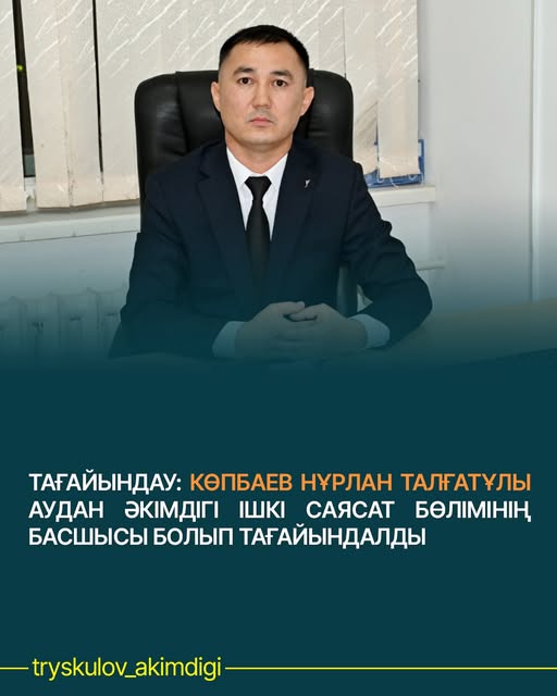 Көпбаев Нұрлан Талғатұлы аудан әкімінің өкімімен аудан әкімдігінің ішкі саясат бөлімінің басшысы болып тағайындалды.