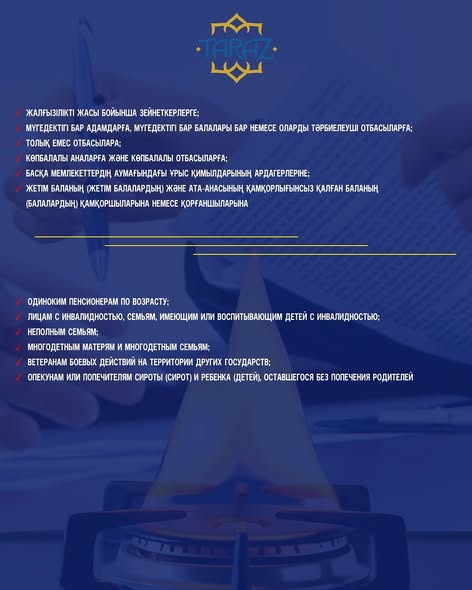 В соответствии с решением Таразского городского маслихата №25-6 от 26 декабря 2024 года предусмотрено предоставление единовременной компенсации расходов на газификацию жилья следующим категориям граждан: