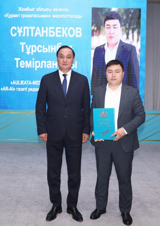 Мемлекет басшысының Жарлығына сәйкес белгілі журналист Оралхан Дәуіт «Құрмет» орденімен, «Ақ жол» газетінің фототілшісі Ақәділ Рысмахан «Ерен еңбегі үшін» медалімен, аудандық басылымдардың бас директоры Олжас Иенберген «Шапағат» медалімен, сала ардагері Жарылқасын Нұралиев «Ақпарат саласының үздігі» төсбелгісімен марапатталды.