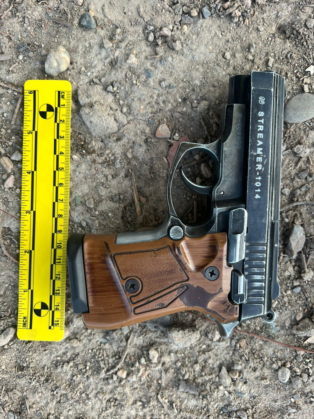 При проведении ОРМ сотрудиниками УКП совместно с сотрудиниками УЖД 158/2 в конце проспекте Толе би г. Тараз заброшенным здание обнаружен полителеновый пакет черного цвета где содержимое: 1 ед.пистолет марки Streamer-1014 за номерам К-006822, 1 штук кабура, 2 ед наручника за #и3180, #02440, 4 штук патрон калибра 9мм, 5 штук патроны калибра 5,45 мм, 1 штук ПР (дубинка). При проверке по базе «webinterface» по категорию «криминальное оружие» установлено что данный ружье похищен из здании ДП в момент массовых беспорядков.