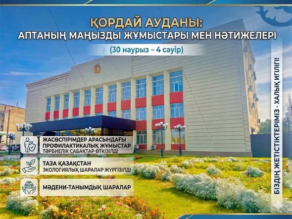 Өткен апта Қордай ауданы үшін нәтижелі кезең болды. Аудан аумағында тазалықты сақтау, қоғамдық тәртіпті қамтамасыз ету, сондай-ақ білім мен руханият бағыттарында жүйелі жұмыстар жүргізілді.